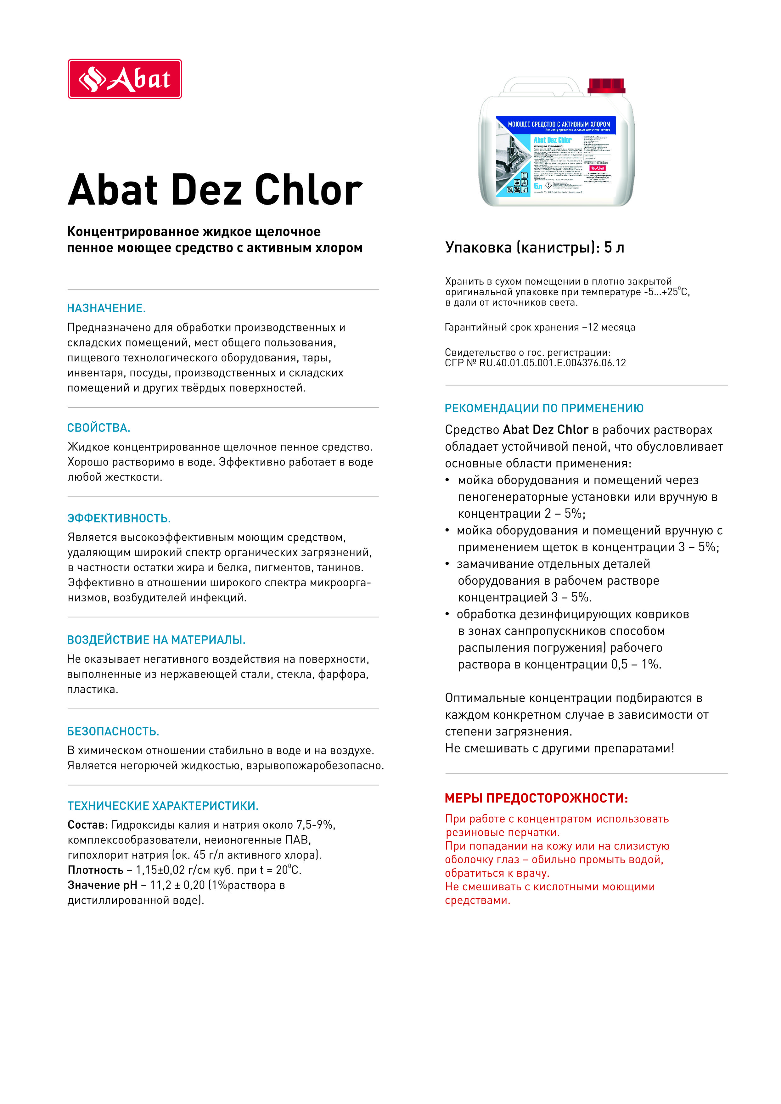 Антисептическое средство Abat Dez Chlor предназначено для обработки производственных и складских помещений, а также мест общего пользования, пищевого технологического оборудования, тары, инвентаря, посуды и других твердых поверхностей