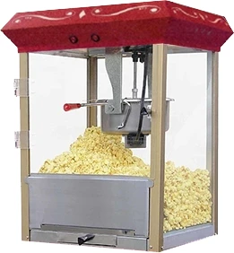 Попкорн аппарат настольный, без тележки, имеет котёл из нержавеющей стали, боковые панели из закалённого стекла, сборник нераскрывшихся зерён, главный выключатель.