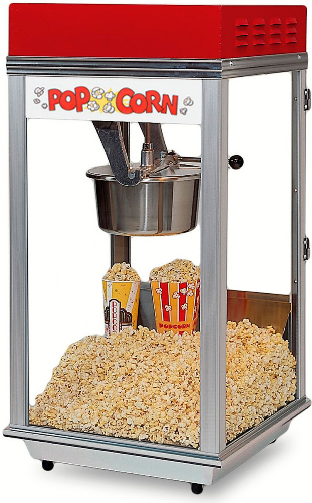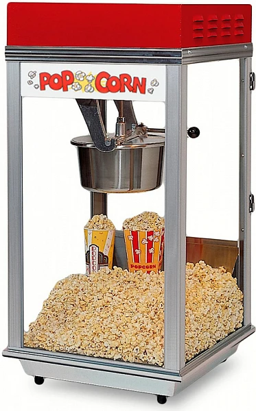 Попкорн аппарат настольный с управлением PowerOff® Control, красным куполом имеет каркас из анодированного алюминия со стальными стойками и котел с поверхностью из нержавеющей стали. Объем котла - 8 унций.