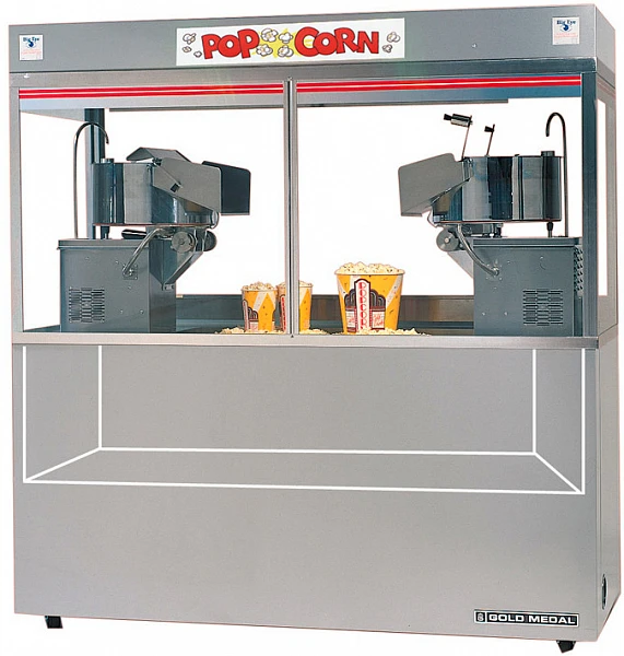 Попкорн аппарат напольный с 2 котлами в закрытом боксе с неоновой вывеской, углубленным гнездом для готовой продукции, электронным управлением нагрева, системой автоматической подачи масла в котел. Объем котлов - 2х48 унций. Аппарат предназначен для приготовления как солёного (с использованием специальной мелкодисперсной соли Flavacol или CorinSalt), так и сладкого попкорна (с использованием сладких глазирующих добавок GlazePop или CorinGlaze с антипригарной добавкой Compound-S).
