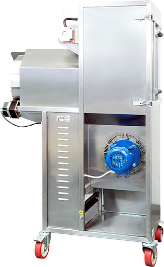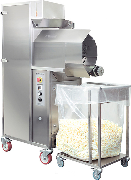 Модель оснащена дозатором и сифтером, куда попадает раскрытое кукурузное зерно, и происходит отделение шелухи и нераскрытых зерен от готового попкорна. В последующем такой попкорн идеально подходит для нанесения карамельной смеси или изготовления попкорна с заданным вкусом. Оборудование выполнено из нержавеющей стали.