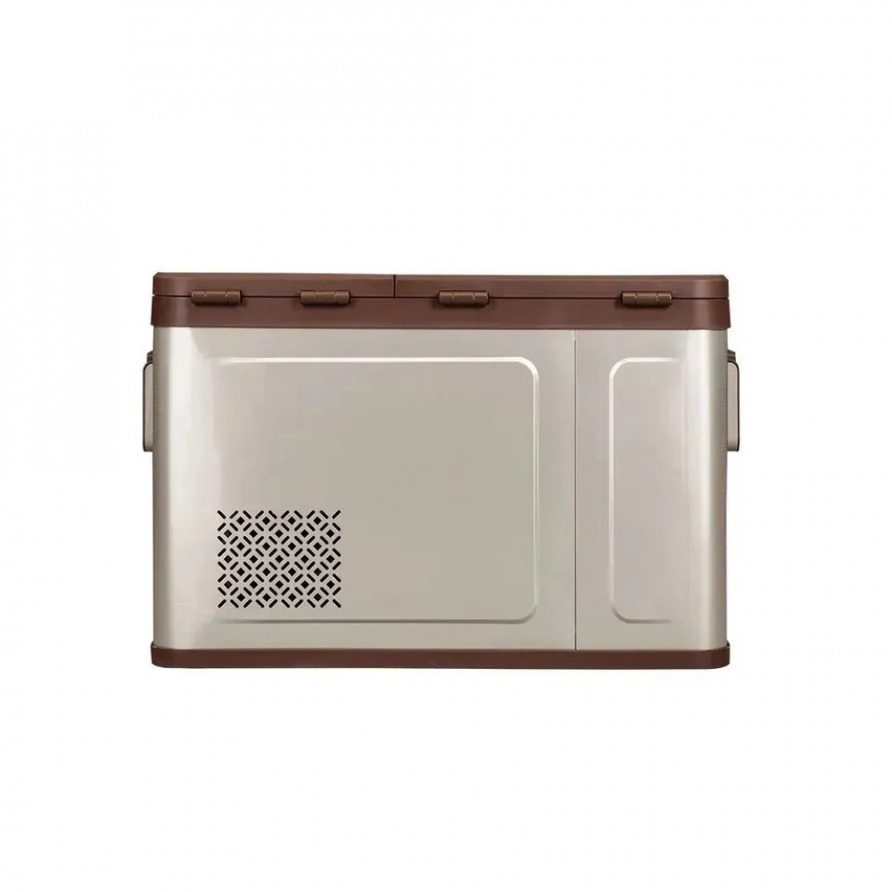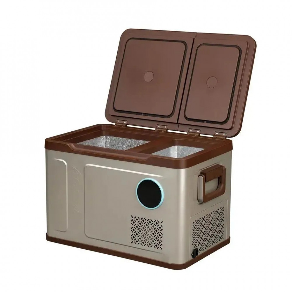 Объем холодильника 38 л, а поддерживаемая температура от +20 до -20°C, что оптимально для хранения продуктов в течение нескольких дней. Внутреннее пространство разделено на две камеры, и в каждой настраивается своя отдельная температура, чтобы одну использовать как морозильник, а вторую — как обычный холодильник. Такая гибкость помогает хранить одновременно и охлажденную, и замороженную еду.