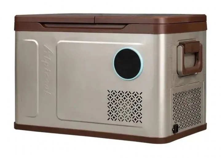 Выделяется современным, минималистичным дизайном. Он компактный, поэтому легко размещается в багажнике или салоне, а круглый светодиодный интуитивно понятный дисплей сразу привлекает внимание. Дополнительный плюс — демпфирующие дверные петли для плавного закрытия дверцы и снижения уровня шума, а также удобные ручки для переноски.