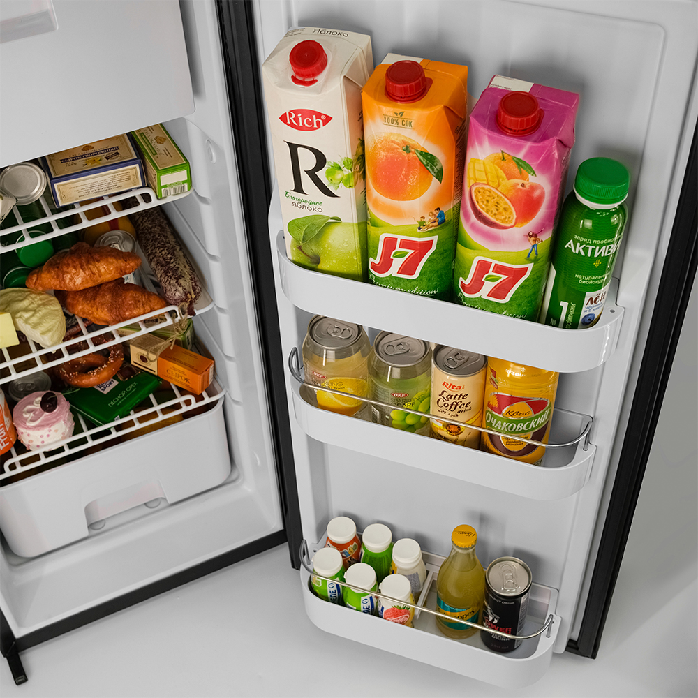 Объем холодильника составляет 91 л, а питание может осуществляться от сети с напряжением 12 или 24 В. Внутри устройства две камеры, одна из которых предназначена для охлаждения, а другая - для замораживания продуктов до температуры -20°C.