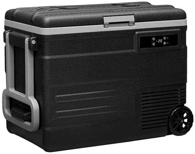 Автохолодильник имеет ручку и колёса для удобного перемещения. Модель Alpicool U55(12/24) будет удачным выбором как для хранения продуктов во время путешествий, так и для охлаждения продуктов во время отдыха на природе.