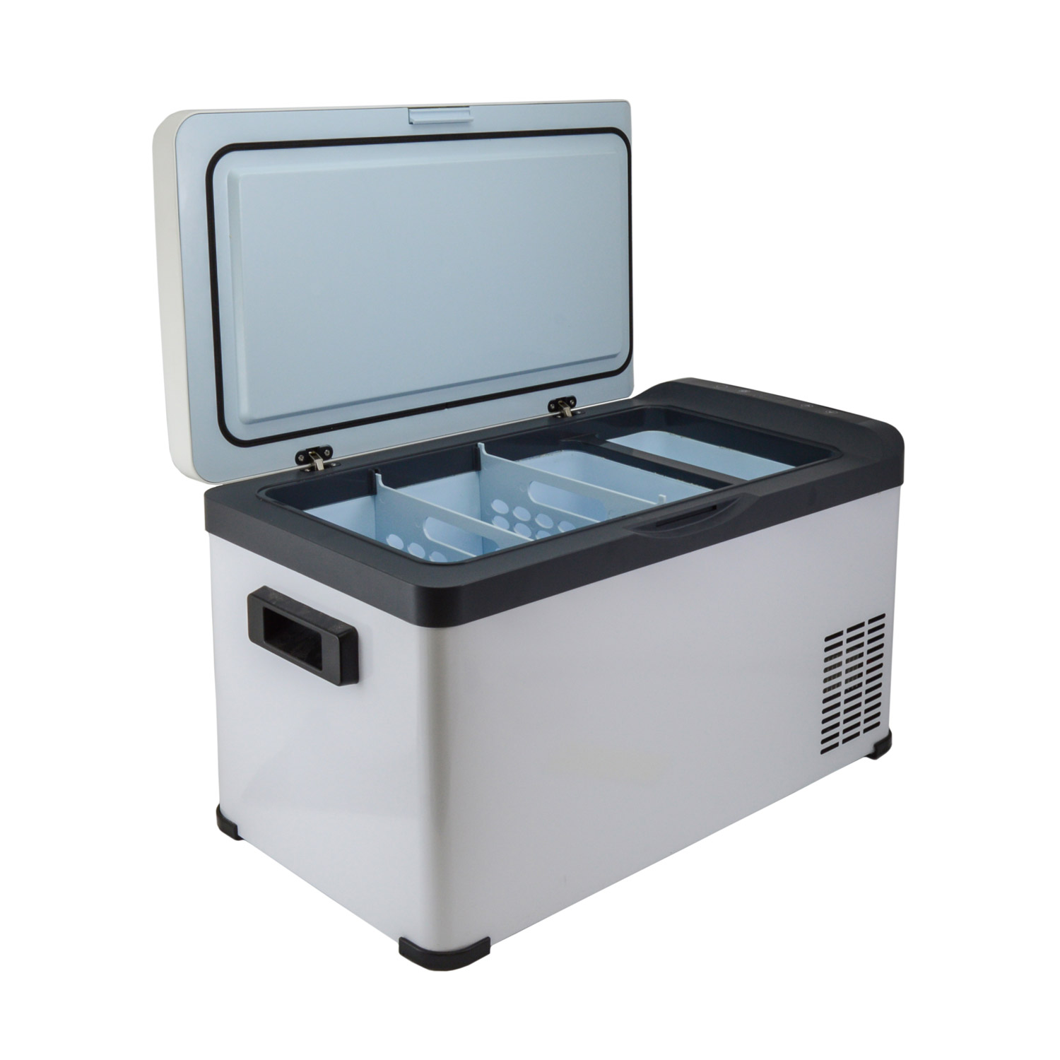 Крышка имеет механический замок, а компактные встроенные ручки позволяют удобно переносить даже полностью заполненный холодильник.