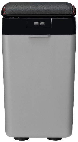 Так же, у данной модели присутствует функция для беспроводной зарядки телефонов и дополнительные USB-разъёмы на задней стороне холодильника. Холодильник имеет небольшой вес и может быстро сниматься с неподвижного крепления для перемещения из автомобиля в автомобиль. Для переноски в корпусе есть ручки, а для быстрого подключения холодильник укомплектован кабелем со штекером для прикуривателя. Крышка фиксируется магнитами и оборудована автодоводчиком для плавного закрытия.