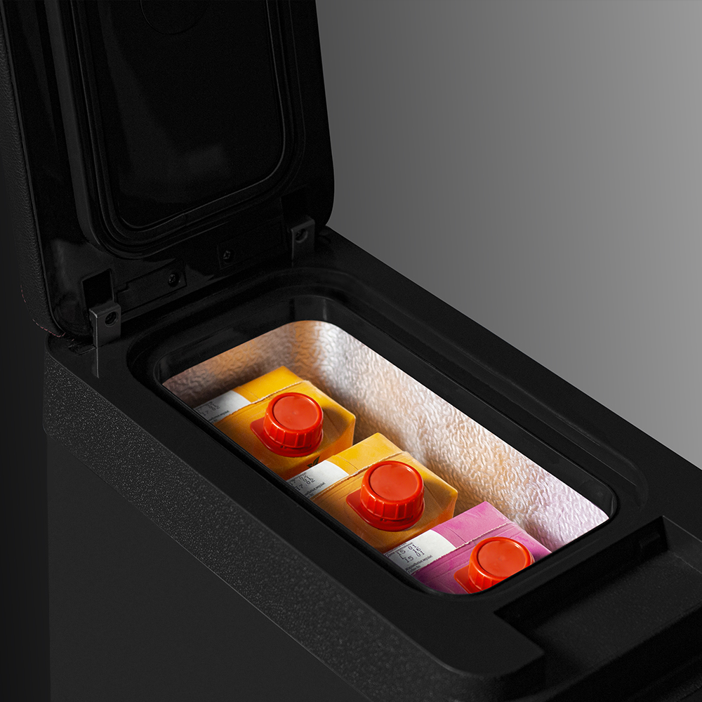 Приятным бонусом будет функция для беспроводной зарядки телефонов и дополнительные USB-разъёмы на задней стороне холодильника. Холодильник имеет небольшой вес. Может быстро сниматься с неподвижного крепления и переставляться из автомобиля в автомобиль. Для переноски в корпусе есть ручки, а для быстрого подключения холодильник укомплектован кабелем со штекером для прикуривателя. Крышка фиксируется магнитами и оборудована автодоводчиком для плавного закрытия.