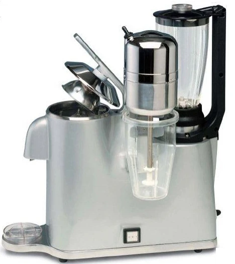 Барный комбайн Vema GR 2021 совмещает следующие функции: соковыжималка для цитрусовых, блендер и миксер для молочных коктейлей.