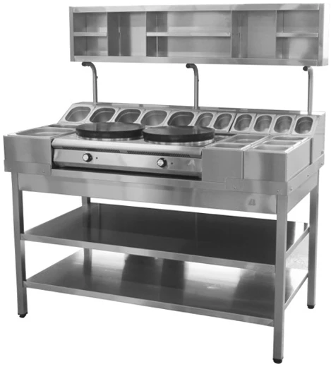 Конструкция представляет собой стол, на столешницу которого установлены холдеры, укомплектованные гастроемкостями различного размера для блинных начинок и теста. Блинному аппарату* отведено место в центре. На полках всегда под рукой место для одноразовой посуды и упаковки.