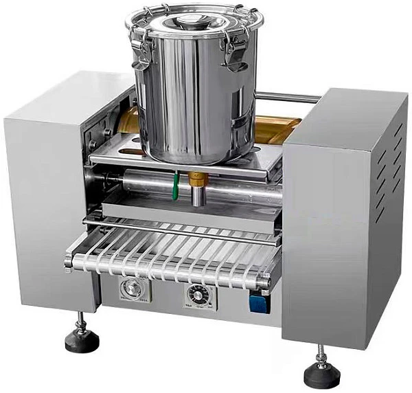 Жидкое тесто попадает на вращающийся жарочный барабан, где блины (крепы) прожариваются. Прожаренные блины попадают на транспортер, с которого забираются в готовом виде.