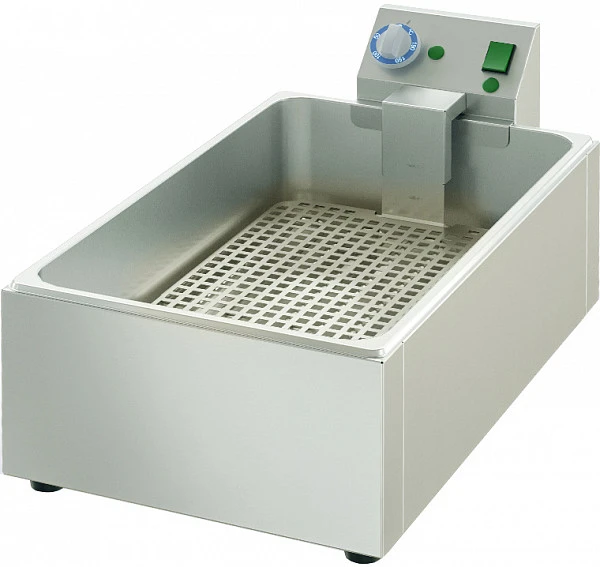 Чебуречница выполнена из пищевой нержавеющей стали. Она состоит из фритюрной ванны и блока управления ТЭНом. Ванна представляет собой нержавеющую гастроемкость GN-1/1 глубиной 150 мм. Она имеет маркировку уровня масла (max и min). Блок управления включает в себя ТЭН и терморегулятор. ТЭН, изготовленный из пищевой нержавеющей стали, обеспечивает нагрев масла. Форма и электромощность ТЭНа оптимальны с точки зрения нагрева фритюра и сохранения его качественных характеристик в течение рабочей смены. Терморегулятор предназначен для поддержания в ванне заданной температуры масла +50°С…+190°С. Специальная нержавеющая решетка, закрывающая ТЭН, исключает контакт чебуреков и ТЭНа, тем самым предотвращая подгорание продукта. В комплекте поставляется кулинарный пинцет для переворачивания и выкладки чебуреков.