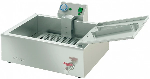 Чебуречница выполнена из пищевой нержавеющей стали. Она состоит из фритюрной ванны и блока управления ТЭНом. Ванна имеет маркировку уровня масла (max и min) и кран для слива масла. Блок управления включает в себя ТЭН и терморегулятор. ТЭН, изготовленный из пищевой нержавеющей стали, обеспечивает нагрев масла. Форма и электромощность ТЭНа оптимальны с точки зрения нагрева фритюра и сохранения его качественных характеристик в течение рабочей смены. Терморегулятор предназначен для поддержания в ванне заданной температуры масла +50°С…+190°С. Специальная нержавеющая решетка, закрывающая ТЭН, исключает контакт чебуреков и ТЭНа, тем самым предотвращая подгорание продукта. После обжарки готовые чебуреки выкладывают на специальный поддон, установленный на борту ванны. Отверстия в поддоне позволяют излишкам масла стекать обратно в ванну, что обеспечивает существенное снижение расхода масла. В комплекте поставляется кулинарный пинцет для переворачивания и выкладки чебуреков.
