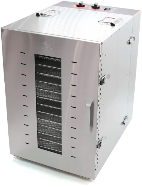Дегидратор оборудован двумя мощными вентиляторами, что обеспечивает равномерный горизонтальный обдув всех 16 решеток.