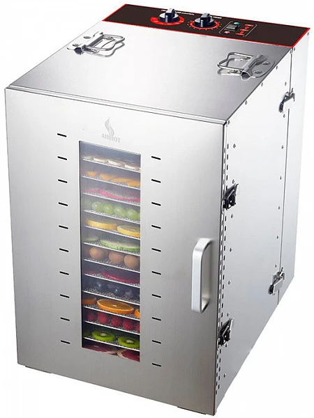 Дегидратор сушилка AIRHOT FD-16G позволяет сушить травы, зелень, фрукты, овощи, ягоды, орехи, грибы, макаронные изделия, а также готовить пастилу, йогурт, вяленое мясо и рыбу, основы для сыроедческих пицц, тортов, пирогов и другие сыроедческие блюда (фруктовые чипсы, хлебцы, козинаки, конфеты, печенье и пирожные) на предприятиях общественного питания и торговли, а также на фермах и сельскохозяйственных предприятиях.