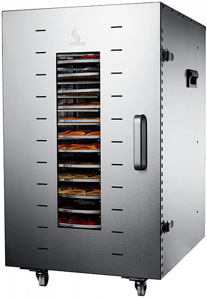 В дегидраторе AIRHOT FD-16GR производится финальная обработка макаронных изделий, пастилы, продуктов из вяленого мяса или рыбы, фруктовых чипсов. В устройстве применяется особая технология движения решеток. За счет этого дегидратация протекает равномернее. Компактные размеры, широкий диапазон регулировок температуры и малошумность делают AIRHOT FD-16GR оптимальным устройством для использования на пищевых предприятиях, фермах, частных домохозяйствах
