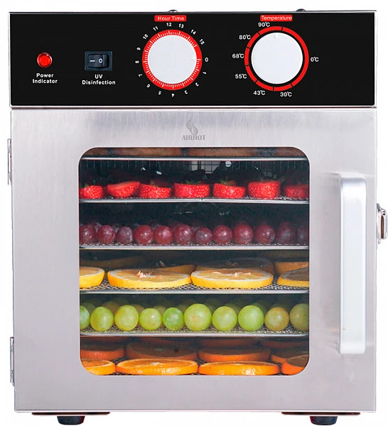 Дегидратор сушилка AIRHOT FD-6G позволяет сушить травы, зелень, фрукты, овощи, ягоды, орехи, грибы, макаронные изделия, а также готовить пастилу, йогурт, вяленое мясо и рыбу, основы для сыроедческих пицц, тортов, пирогов и другие сыроедческие блюда (фруктовые чипсы, хлебцы, козинаки, конфеты, печенье и пирожные) на предприятиях общественного питания и торговли, а также на фермах и сельскохозяйственных предприятиях.