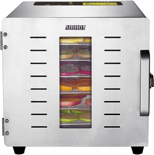 Дегидратор сушилка AIRHOT FD-6N позволяет сушить травы, зелень, фрукты, овощи, ягоды, орехи, грибы, макаронные изделия, а также готовить пастилу, йогурт, вяленое мясо и рыбу, основы для сыроедческих пицц, тортов, пирогов и другие сыроедческие блюда (фруктовые чипсы, хлебцы, козинаки, конфеты, печенье и пирожные) на предприятиях общественного питания и торговли, а также на фермах и сельскохозяйственных предприятиях.