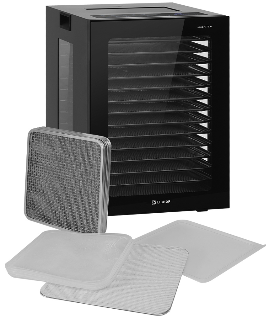 Дегидратор сушилка Libhof FDA-14 позволяет сушить травы, зелень, фрукты, овощи, ягоды, орехи, грибы, макаронные изделия, а также готовить пастилу, йогурт, вяленое мясо и рыбу, основы для сыроедческих пицц, тортов, пирогов и другие сыроедческие блюда (фруктовые чипсы, хлебцы, козинаки, конфеты, печенье и пирожные) на предприятиях общественного питания и торговли, а также на фермах и сельскохозяйственных предприятиях.