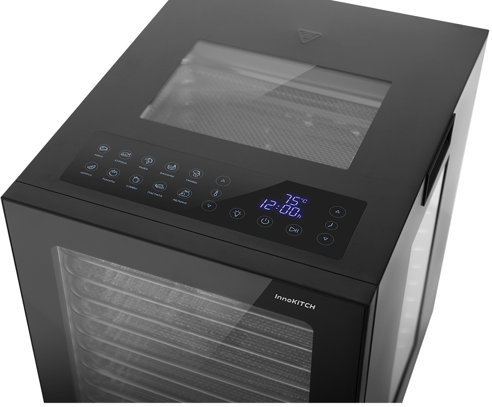 В дегидраторе уже предусмотрено 10 автоматических программ и имеется возможность ручной настройки температуры в диапазоне от 35° до 75°, что позволяет выбрать оптимальный режим для каждого вида продуктов.