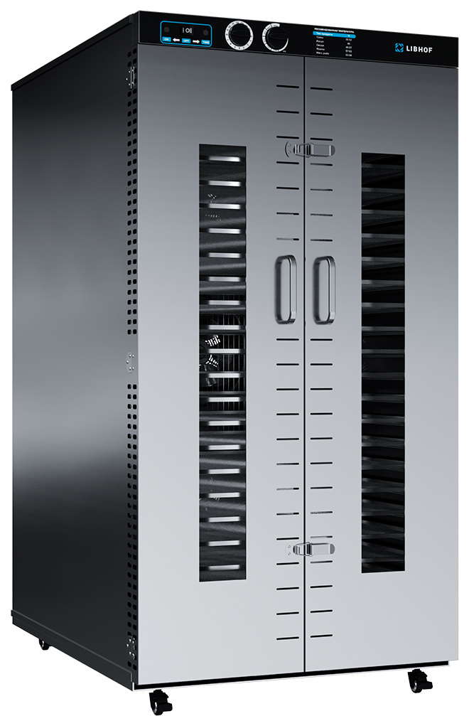 Дегидратор сушилка Libhof FDT-24 позволяет сушить травы, зелень, фрукты, овощи, ягоды, орехи, грибы, макаронные изделия, а также готовить пастилу, йогурт, вяленое мясо и рыбу, основы для сыроедческих пицц, тортов, пирогов и другие сыроедческие блюда (фруктовые чипсы, хлебцы, козинаки, конфеты, печенье и пирожные) на предприятиях общественного питания и торговли, а также на фермах и сельскохозяйственных предприятиях.
