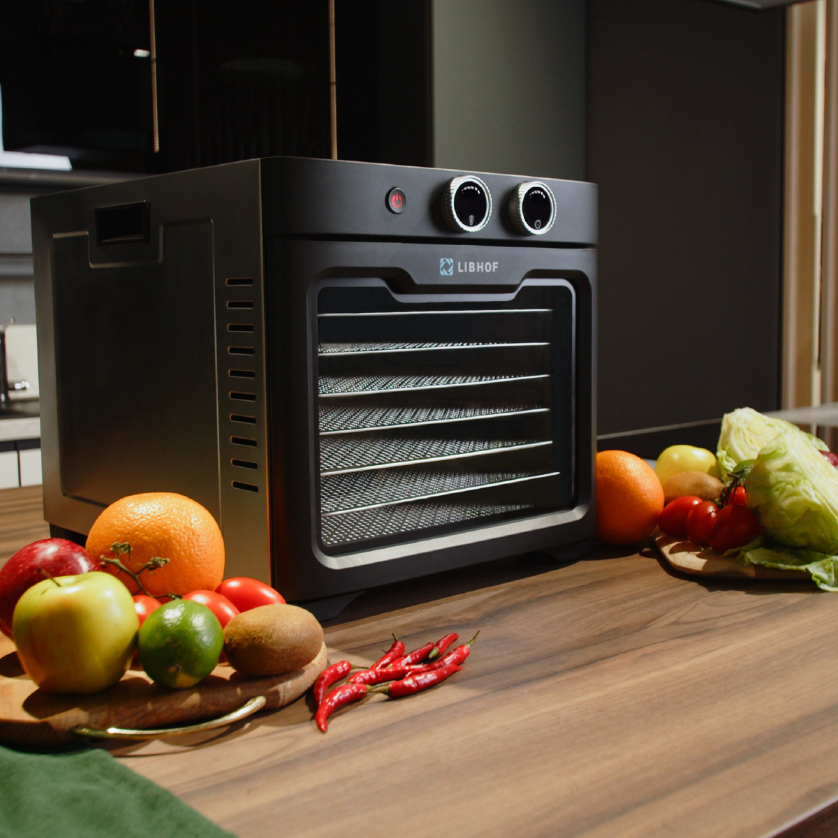 Дегидратор сушилка Libhof FDW-08 позволяет сушить травы, зелень, фрукты, овощи, ягоды, орехи, грибы, макаронные изделия, а также готовить пастилу, йогурт, вяленое мясо и рыбу, основы для сыроедческих пицц, тортов, пирогов и другие сыроедческие блюда (фруктовые чипсы, хлебцы, козинаки, конфеты, печенье и пирожные) на предприятиях общественного питания и торговли, а также на фермах и сельскохозяйственных предприятиях.