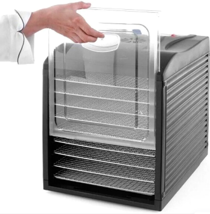 Прочный корпус изготовлен из нержавеющей стали предназначен для использования на профессиональной кухне. А также идеально подходит для мясных магазинов, специализированных магазинов и магазинов по продаже диетических продуктов. Это устройство позволяет сушить самые популярные продукты вяленое мясо, мюсли, фрукты, овощи и многое другое!