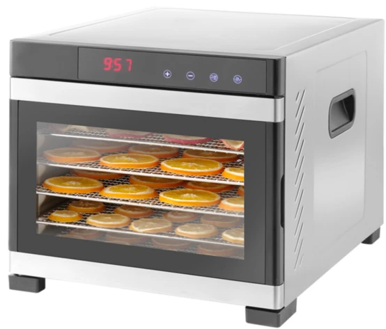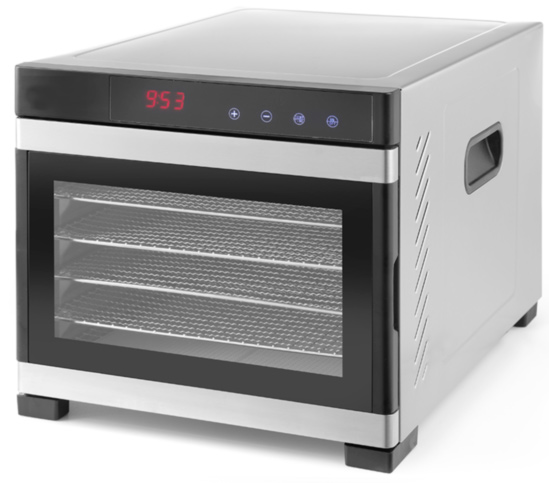 Прочный корпус изготовлен из нержавеющей стали предназначен для использования на прфессиональной кухни. А также идеально подходит для мясных магазинов, специализированных магазинов и магазинов по продаже диетических продуктов. Это устройство позволяет сушить самые популярные продукты вяленое мясо, мюсли, фрукты, овощи и многое другое!