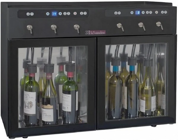 Диспенсер для вина La Sommeliere DVV6M предназначена для разлива вина по бокалам и при этом вино не портится, так как диспенсер укомплектован сменными баллонами с азотом (в комплекте 2 шт.) и вино не окисляется до 3-х недель. Охлаждение компрессорное и температура легко настраивается на электронном контроллере в диапазоне от +7 до +18 градусов Цельсия управления с индикацией температуры. Установить сразу можно шесть бутылок вина объемом 0,75 л. по три в каждую зону со своей температурой. Это отличное решение для заведений, где устраиваются дегустации или продают вино по бокалам.