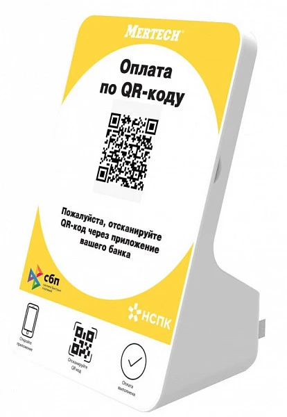 Дисплей QR-кодов Mertech QR-PAY YELLOW — это современное решение для приема платежей. Устройство подключается к онлайн-кассе. После оформления покупки на дисплей выводится уникальный код для каждого клиента. Покупатель сканирует код смартфоном и оплачивает покупки в приложении банка.