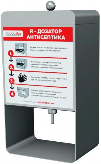 - Дозатор оснащен клапаном, который выдаёт необходимую порцию антисептика при нажатии на клапан снизу вверх ладонью