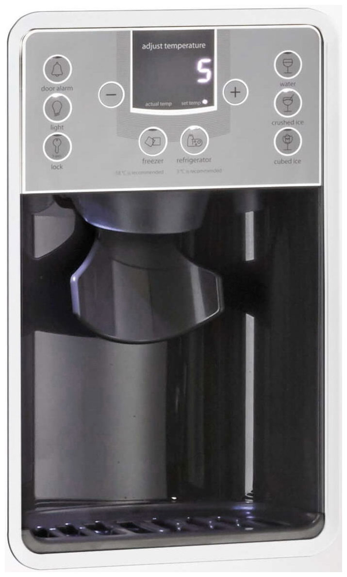 Диспенсер на двери морозилки может подавать холодную воду или кубики льда – до 1,5 кг в сутки. Холодильник подключается к водопроводу – его фильтр поглощает грязь и растворённые минералы, а также уничтожает бактерии и вирусы.