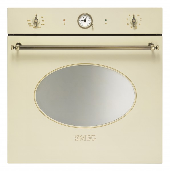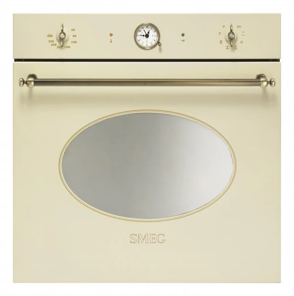 Духовой шкаф электрический SMEG SFP805PO относится к дизайнерской линейке Coloniale, которую можно отнести к ретро-стилю. Кремовый цвет корпуса удачно дополняется латунными ручками, переключателями и таймером. Также на панели управления расположены два световых индикатора. Первый показывает работу термостата, а второй — блокировку дверцы при пиролитической очистке. Рабочая температура варьируется от 50 до 280 градусов. Электронный контроль поддерживает её с высокой точностью, что даёт возможность готовить сложные блюда, чувствительные к перепадам, например, суфле.