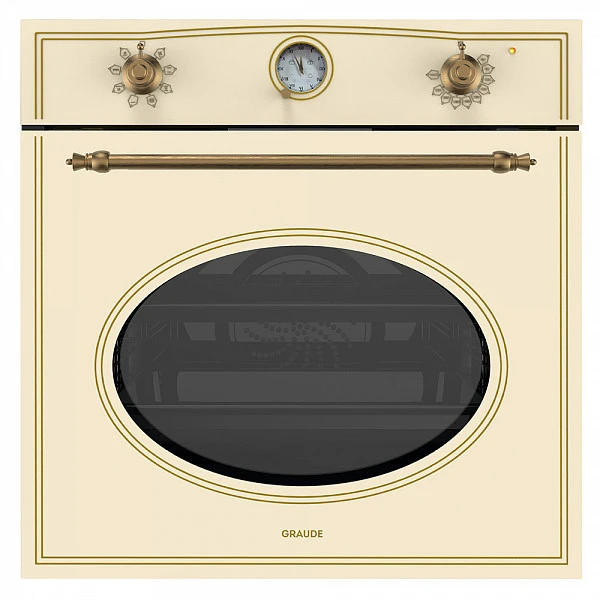 Духовой шкаф Graude BK 60.1 EM объемом 67 л выполнен в бежевом оттенке «античный белый». Изящная форма смотрового окошка и переключатели из бронзы подчеркивают стиль Classic бытовой техники, который идеально подойдет для кухонь в ретро-дизайне или в стиле эклектика.