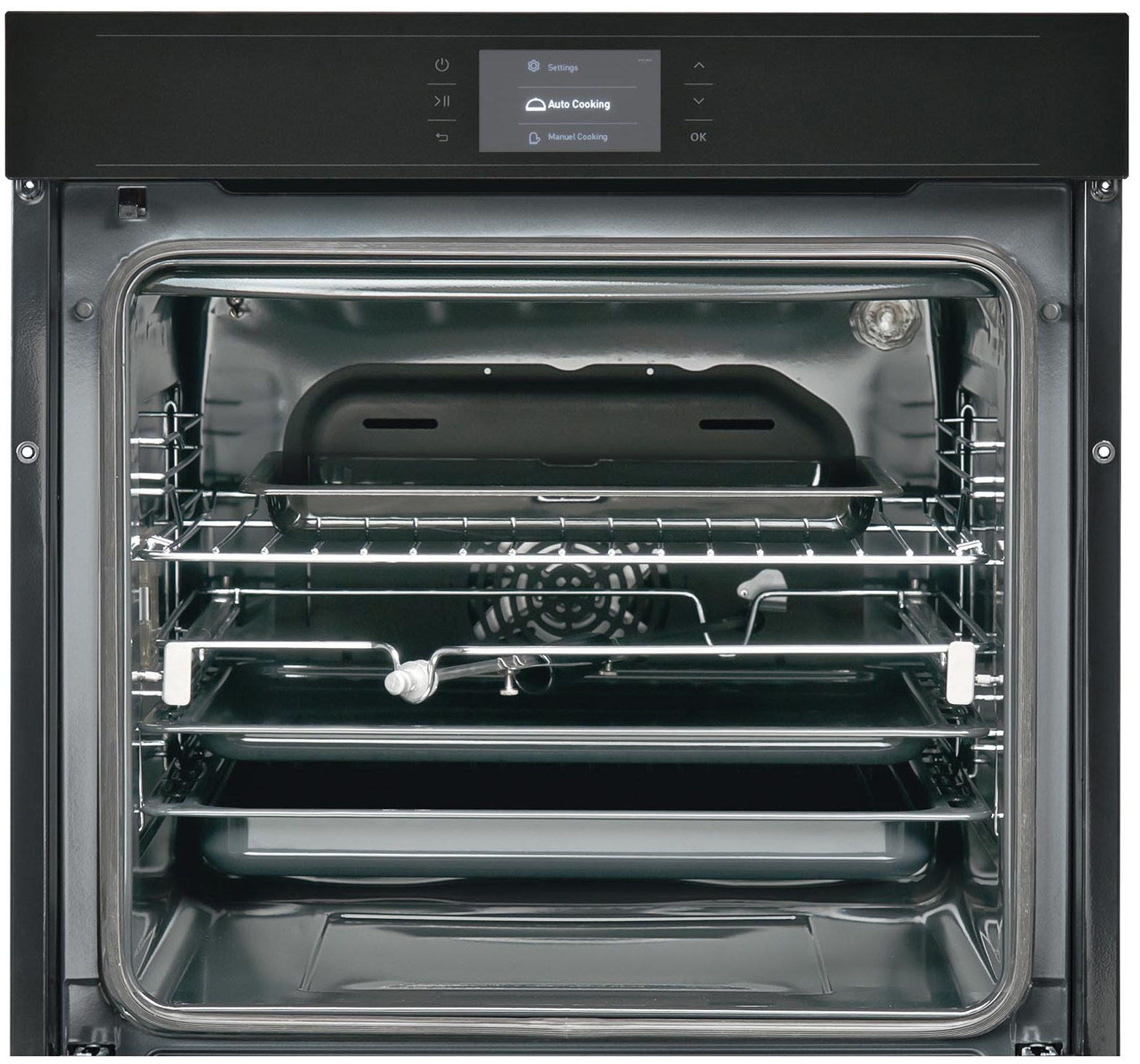 Телескопические направляющие позволят выдвигать противень в одно прикосновение, а каталитическая задняя стенка поможет Вам легче сохранять кухонную плиту в идеальном состоянии. Очищение задней стенки происходит путем автоматического расщепления жира во время приготовления пищи.