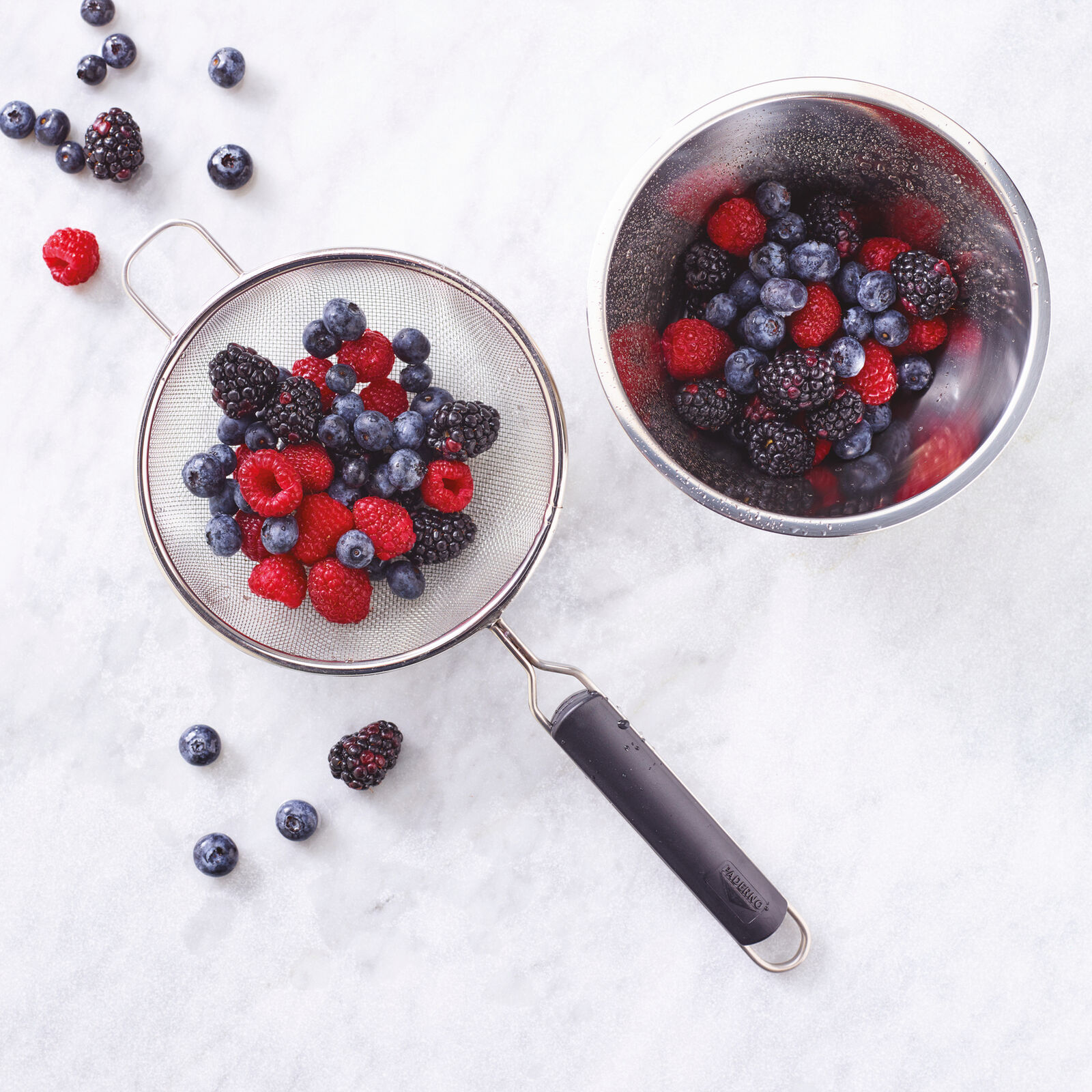Его длинная, не нагревающаяся ручка из АБС-пластика позволяет надежно разместить его над кастрюлей или рабочей миской.