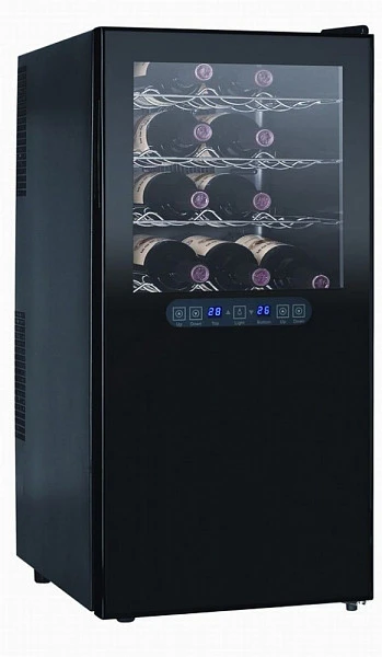 Холодильник вмещает до 24 бутылок вина объемом 0,75 л.