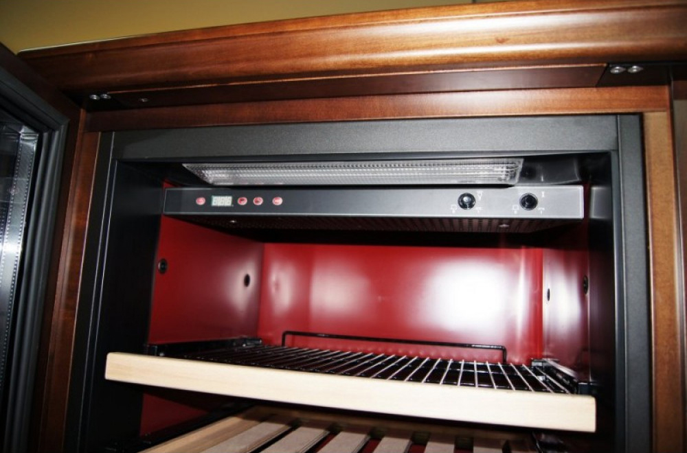 Шкаф оснащен статической системой охлаждения на базе компрессора SECOP (Danfoss), которая понижает температуру вина и сохраняет оптимальную влажность внутри камеры. Комплектуется шкаф четырнадцатью полками.