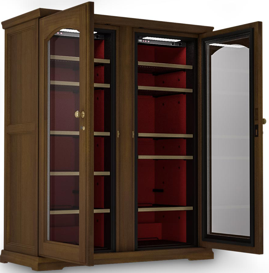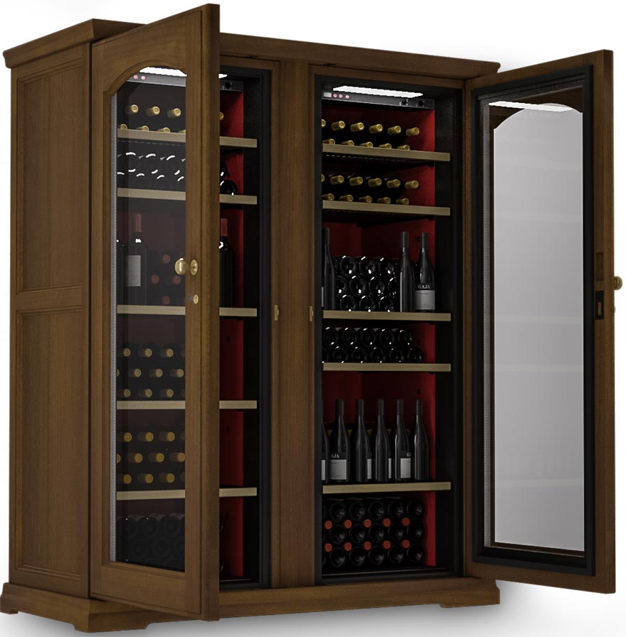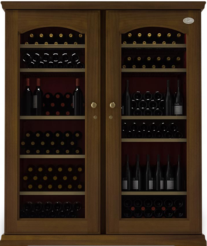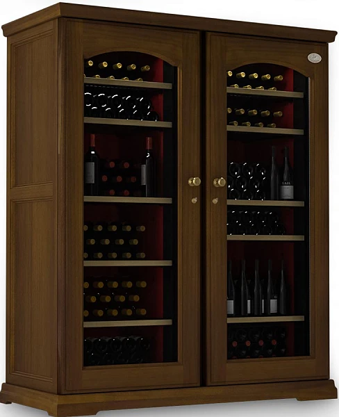 Корпус холодильника металлический, внешняя отделка выполнена из древесины Risto Line в четырех цветовых решениях. Модель двухдверная, каждая дверца изготовлена из двойного стеклопакета с защитой от уф лучей, имеет встроенный замок и удобную ручку.