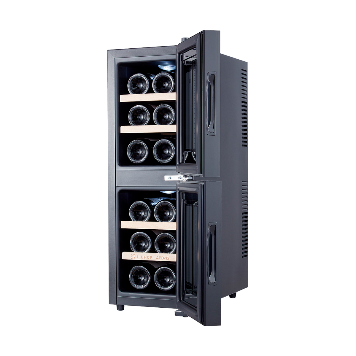 Винный шкаф двухзонный Libhof APD-12 black предназначен для хранения вина в оптимальных условиях (температура, влажность, защита от УФ излучения, вибраций и т. д.).