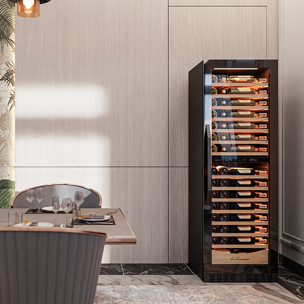 Винный холодильник оснащён надёжным и экономичным компрессором. Ручка, вентиляционная решётка и замок выполнены в цвете корпуса.