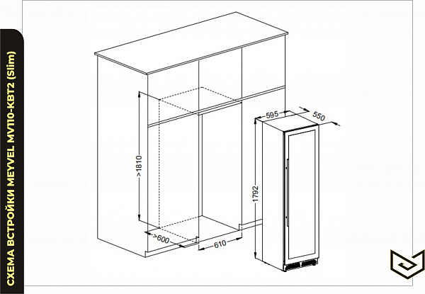 MV110-KBT2(Slim) может устанавливаться как отдельно, так и встраиваться в нишу. За счёт того, что верхняя петля двери не выступает за пределы корпуса и шкаф оснащён встроенной системой вентиляции- эта модель устанавливается в нишу с минимальными зазорами.