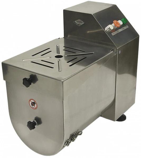 Для загрузки фарша необходимо открыть крышку с отверстиями-дозаторами, затем открыть крышку разгрузочного отверстия, установить ворошитель. Закрыть крышку разгрузочного отверстия. Ингредиенты для перемешивания загрузить в бункер. Закрыть крышку с отверстиями-дозаторами. Выбрать направление вращения ворошителя нажатием кнопки «Пуск» или «Реверс». Перемешивать ингредиенты до получения необходимой консистенции. В процессе перемешивания продукта через отверстия-дозаторы на крышке можно добавлять дополнительные ингредиенты.