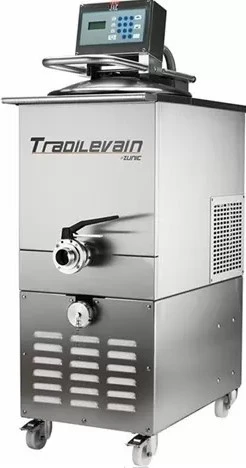 Аппарат для ферментации JAC TL40 используется для того, чтобы с безукоризненной точностью производить и хранить жидкую закваску. Он является новаторским по принципу действия. Смешивание происходит с помощью встроенного погружного винта, обеспечивающего гомогенность и стабильность массы. Данная система перемешивания не нуждается в чистке, поскольку сам шнек расположен в глубине емкости. Резервуар оснащен большой герметичной крышкой, препятствующей доступу кислорода (анаэробные условия), полностью открывающейся для удобства загрузки муки и горячей воды (45°). Выполненный целиком из нержавеющей стали, аппарат не требует особого ухода (нет необходимости в очистке cкребков или же лопастей смесителя). Холодильная установка позволяет контролировать температуру закваски во время различных производственных циклов.