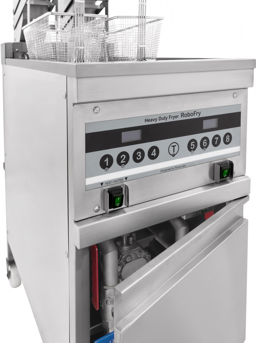 Контроллер RoboLabs позволяет максимально гибко настраивать режим работы фритюрницы, переключать фритюрницу в режим ожидания в периоды простоя и затем быстро выводить на рабочий режим. Данная опция способна значительно уменьшить интенсивность окисления масла. Кроме того, можно установить периодичность фильтрации масла и записать до 4 программ на каждую корзину.