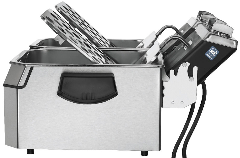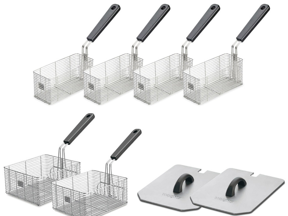 Корпус, ванна и нагревательный элемент выполнены из нержавеющей стали, корзины со съемными ручками - из проволочной сетки из нержавеющей стали, защитная крышка из нержавеющей стали.