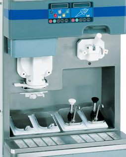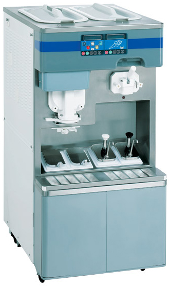 - Фризер оснащён 2 шестерёнчатыми помпами, мешалками в цилиндре, воздушным охлаждением конденсатора, топпинговой станцией для украшения мороженого топпингами (комнатной температуры и подогретыми). Шестерёнчатые помпы нагнетают сырьё с воздухом в цилиндр, взбитость можно регулировать: мороженого до 70-80% и коктейля до 65%.
