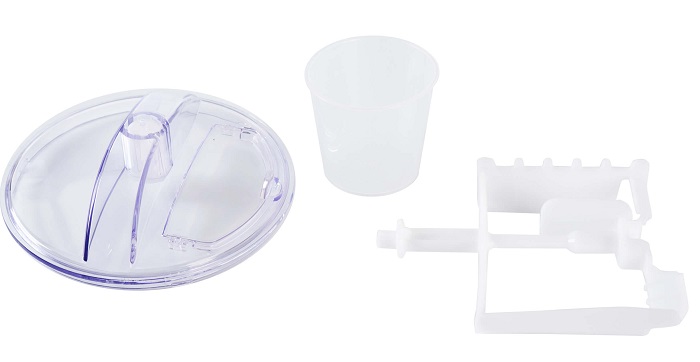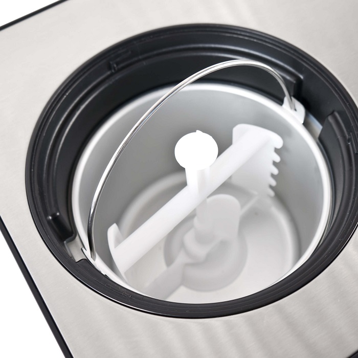 В комплект поставки входит съемный резервуар из алюминия с антипригарным покрытием и съемная мешалка, которые позволяют за один рабочий цикл длительностью до 60 мин приготовить 1,5 л мороженого.