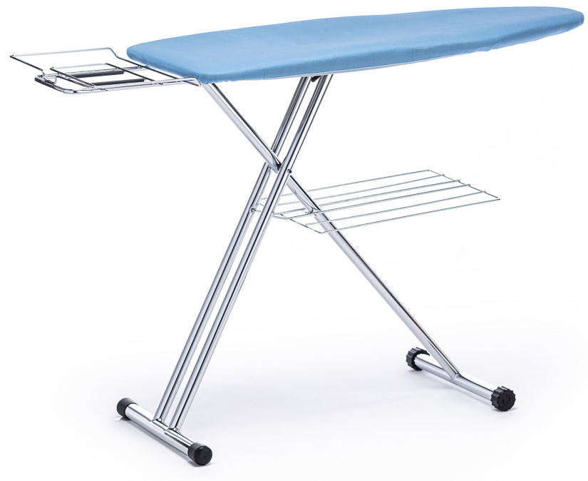 Гладильная доска Metalnova Star компактная, устойчивая с регулировкой высоты гладильной платформы до одиннадцати положений. Имеет твердую гладильную платформу из огнеупорного материала, на которую одевается чехол влагоустойчивый и жаропрочный. Ножки выполнены из хромированного металла, а резиновые наконечники позволяют отрегулировать устойчивое положение доски по горизонтали. Имеется подставка под утюг и нижняя подставка для белья.