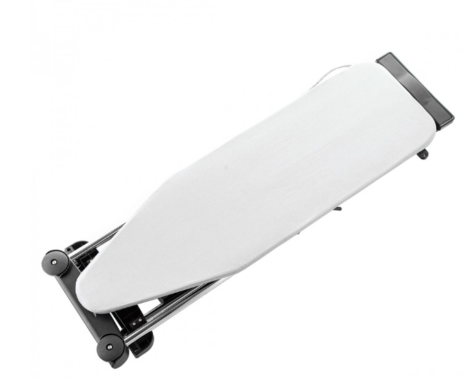 Рабочая поверхность модели — 122 х 38 см. Такой размер позволяет удобно разместить на гладильной доске изделие полностью. Размер гладильной доски в сложенном виде – 132 х 18 х 40 см. Благодаря мобильности модели, можно с легкостью найти место для хранения даже в самой маленькой квартире. Уровень высоты модели плавно регулируется от 85 до 100 см. Это очень удобно, так как каждый пользователь сможет установить высоту доски под свой рост.